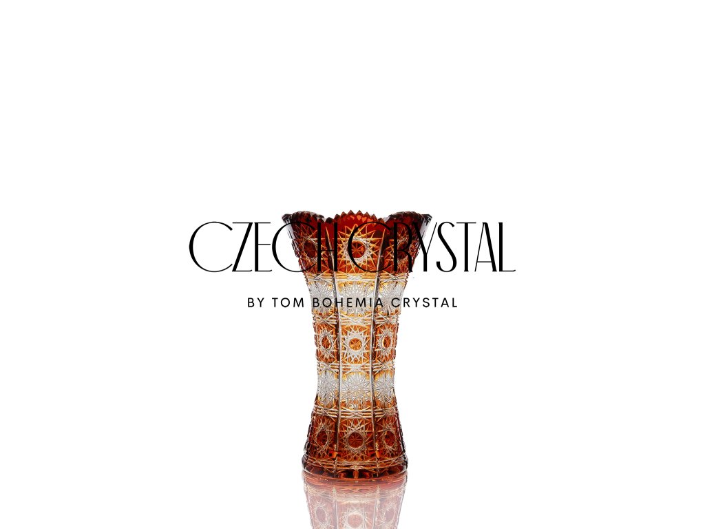 This exquisite Bohemian crystal vase is a true celebration of traditional glass craftsmanship. Featuring a rich amber overlay on clear crystal, the piece is meticulously hand-cut to reveal an intricate network of geometric stars, cross-hatching, and fine linear details that shimmer beautifully in the light.